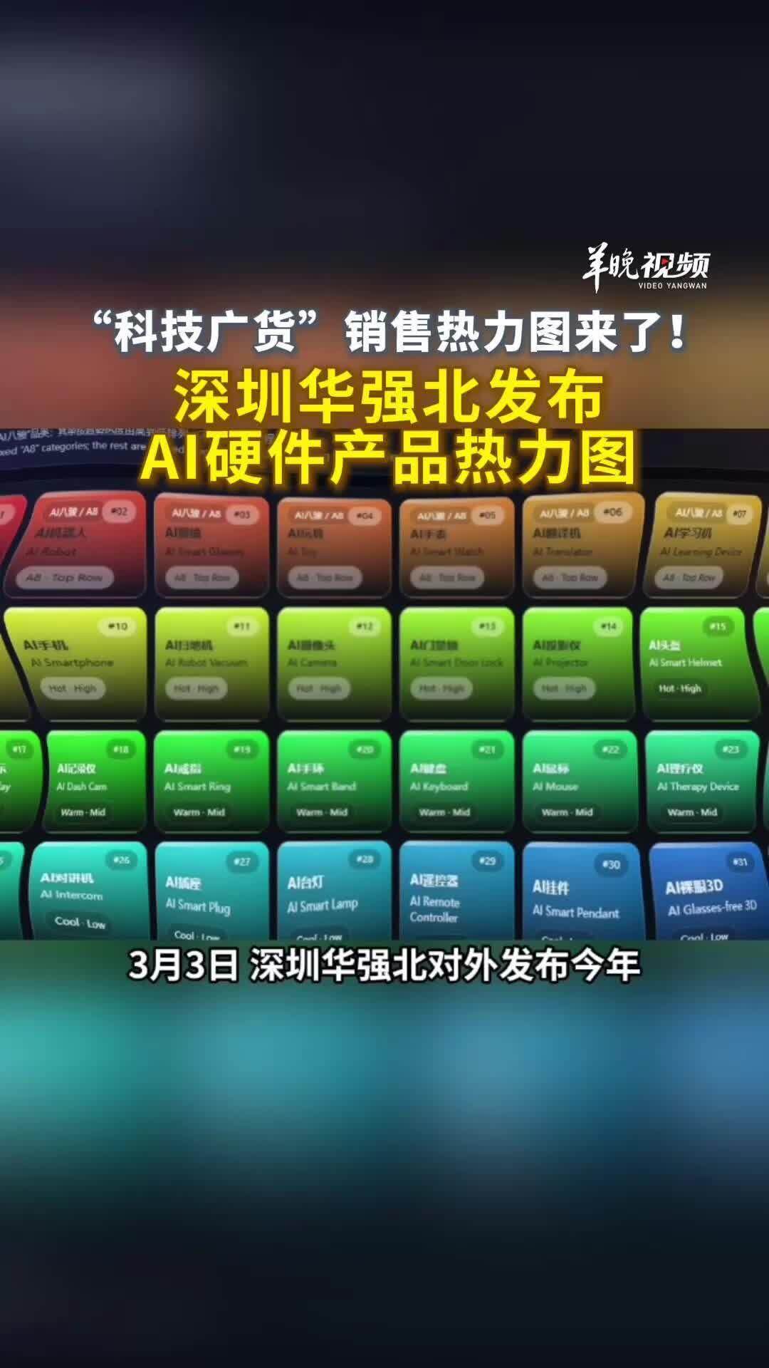 3月3日,通过直播镜头,深圳华强北对外发布今年1-2月AI硬件产品全球销售热力图。
